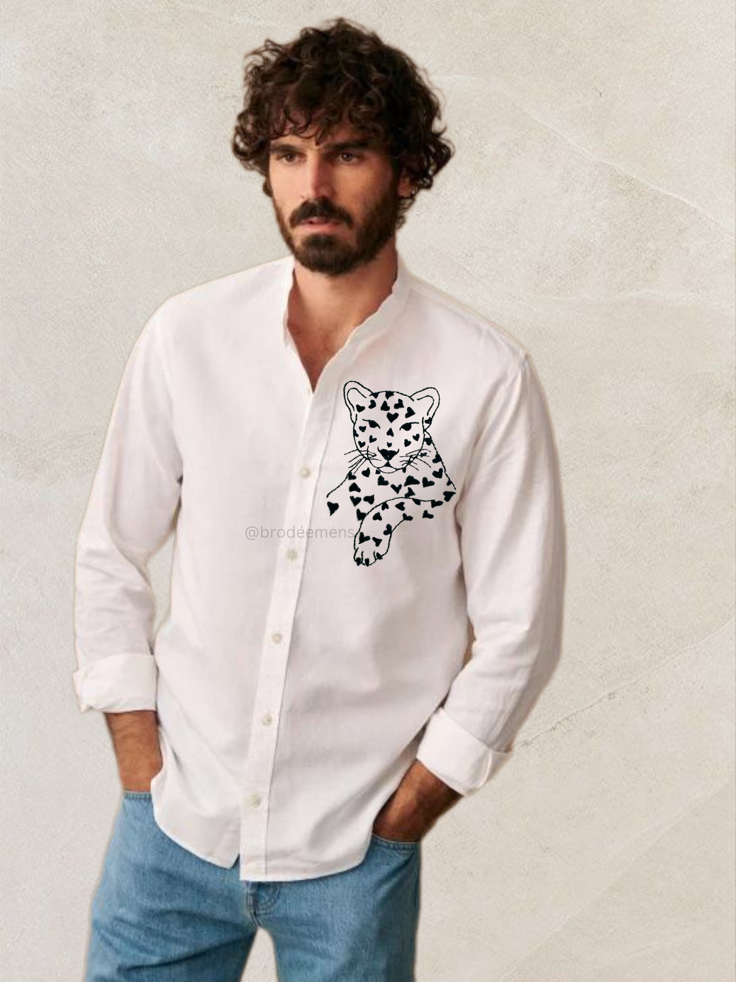 A tiger with an alluring hearts all over the motif depicts love is the strongest weapon of all. Hand-embroidered details enhances the look of the shirt.