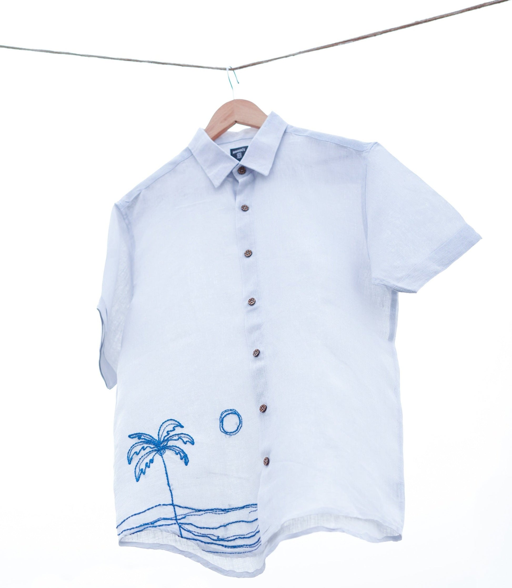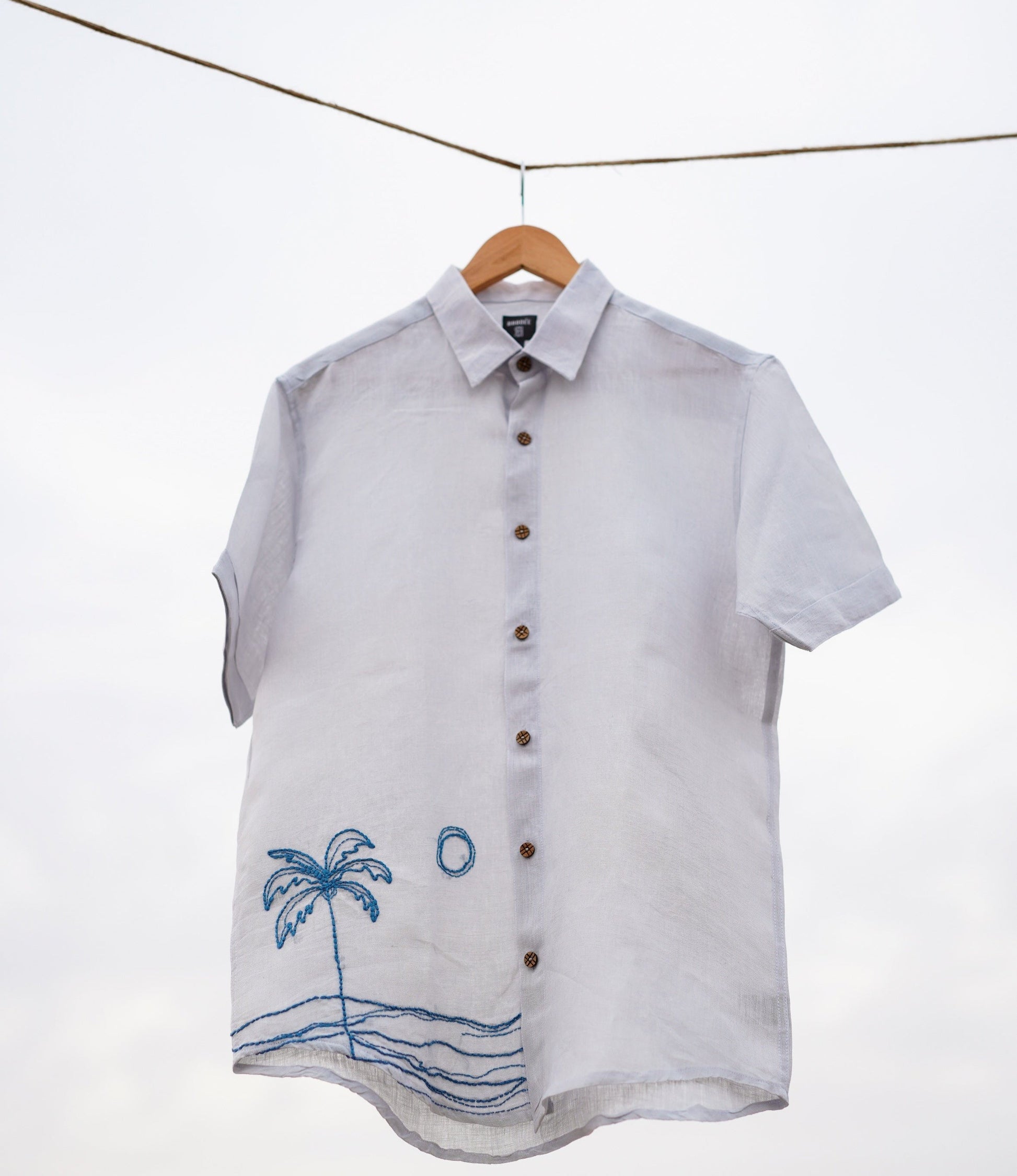 A sweet breeze and a patch of shade are the loveliest gifts on hot summer days. Hand-embroidered palm tree on the blue linen fabric gives a complete breezy vibe.