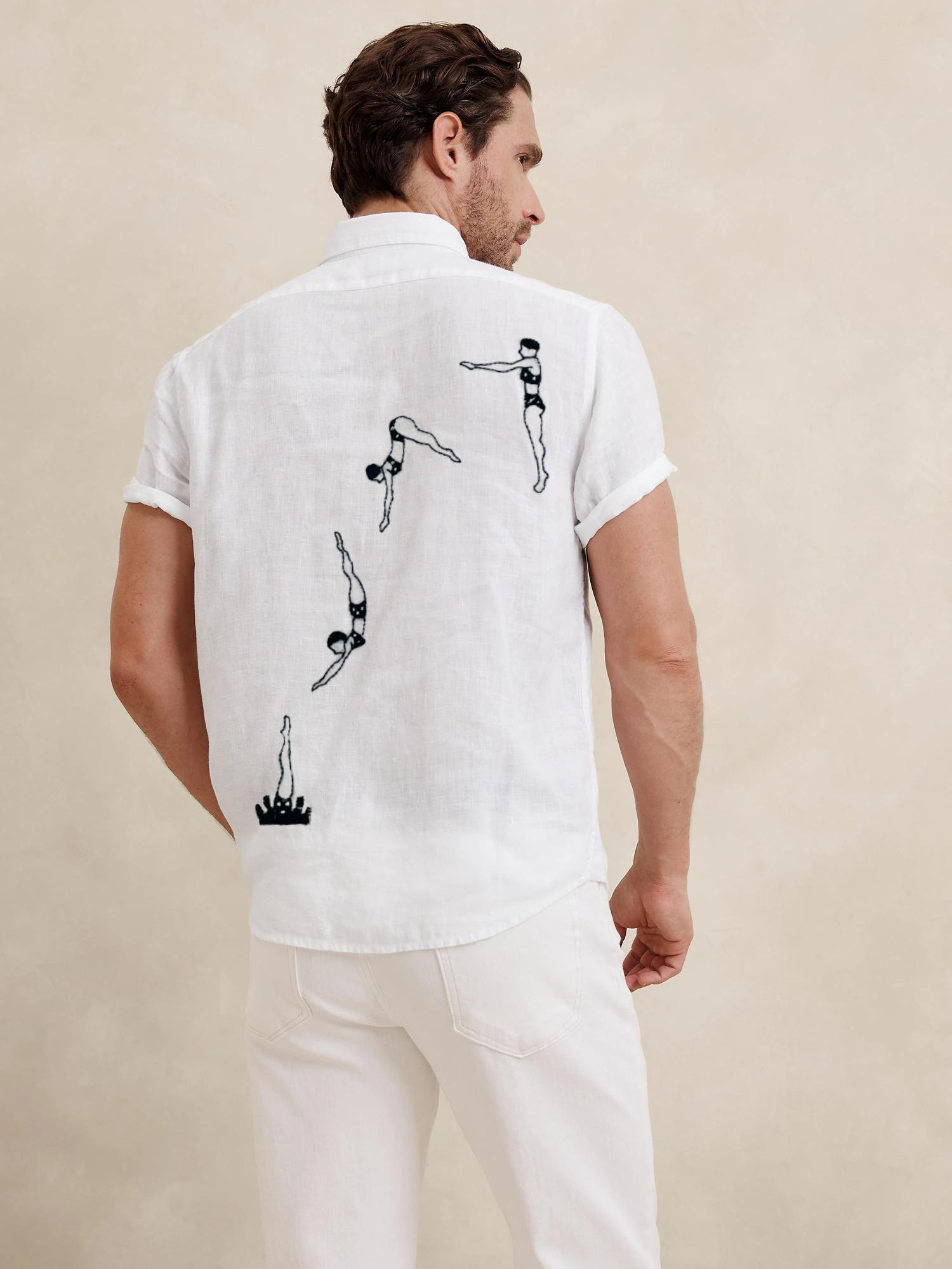 This shirt beautifullydepicts the stages of diving. A complete hand embroidered detail work is done to make it on of a kind shirt.