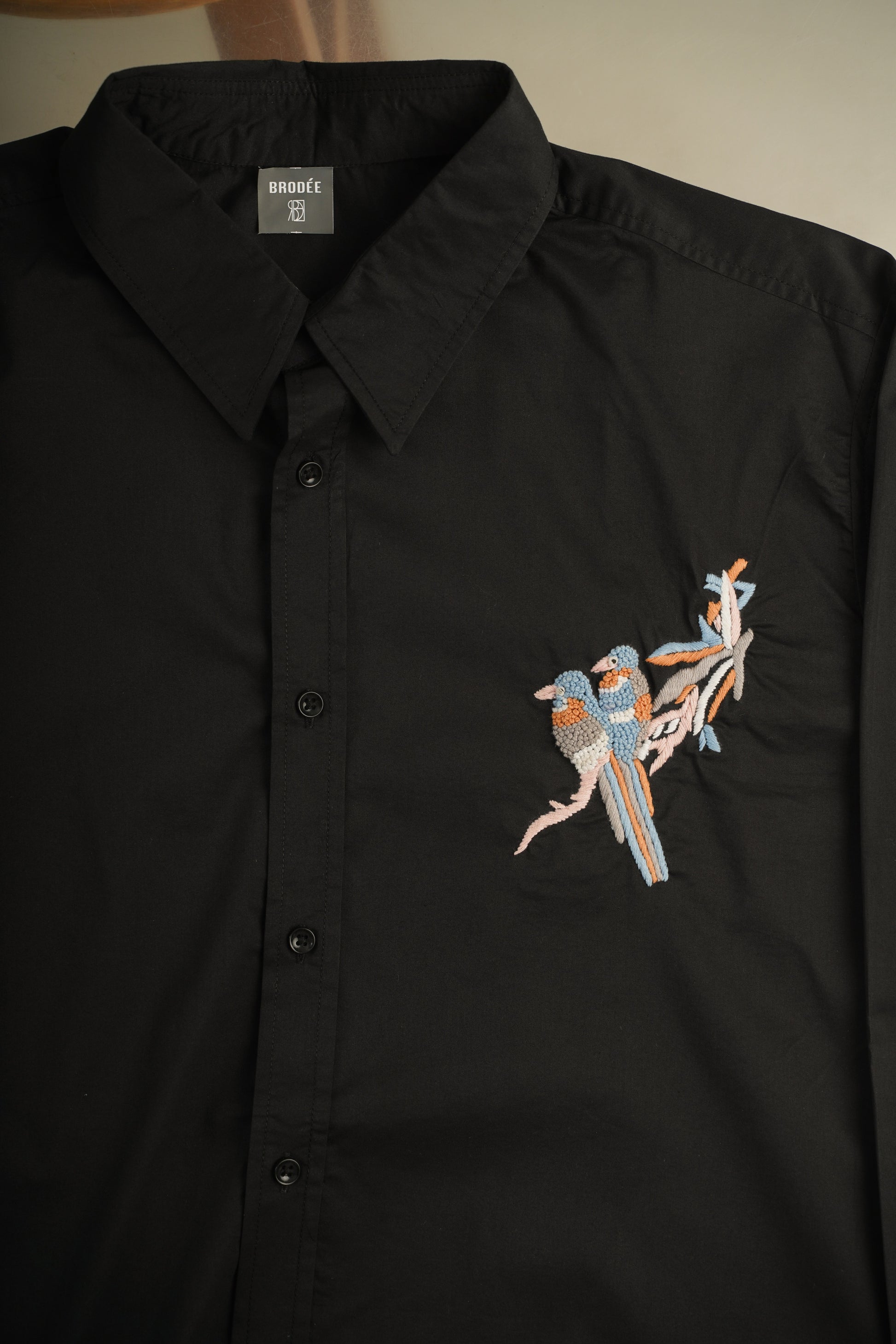 This Brodée shirt in black giza cotton shines bright. An appealing hand embroidery technique (French Knot) in which yarn/thread is knotted around itself is used for this particular motif on the shirt. A kind of a decorative stitch which forms a three-dimensional knots on the surface of a textile.