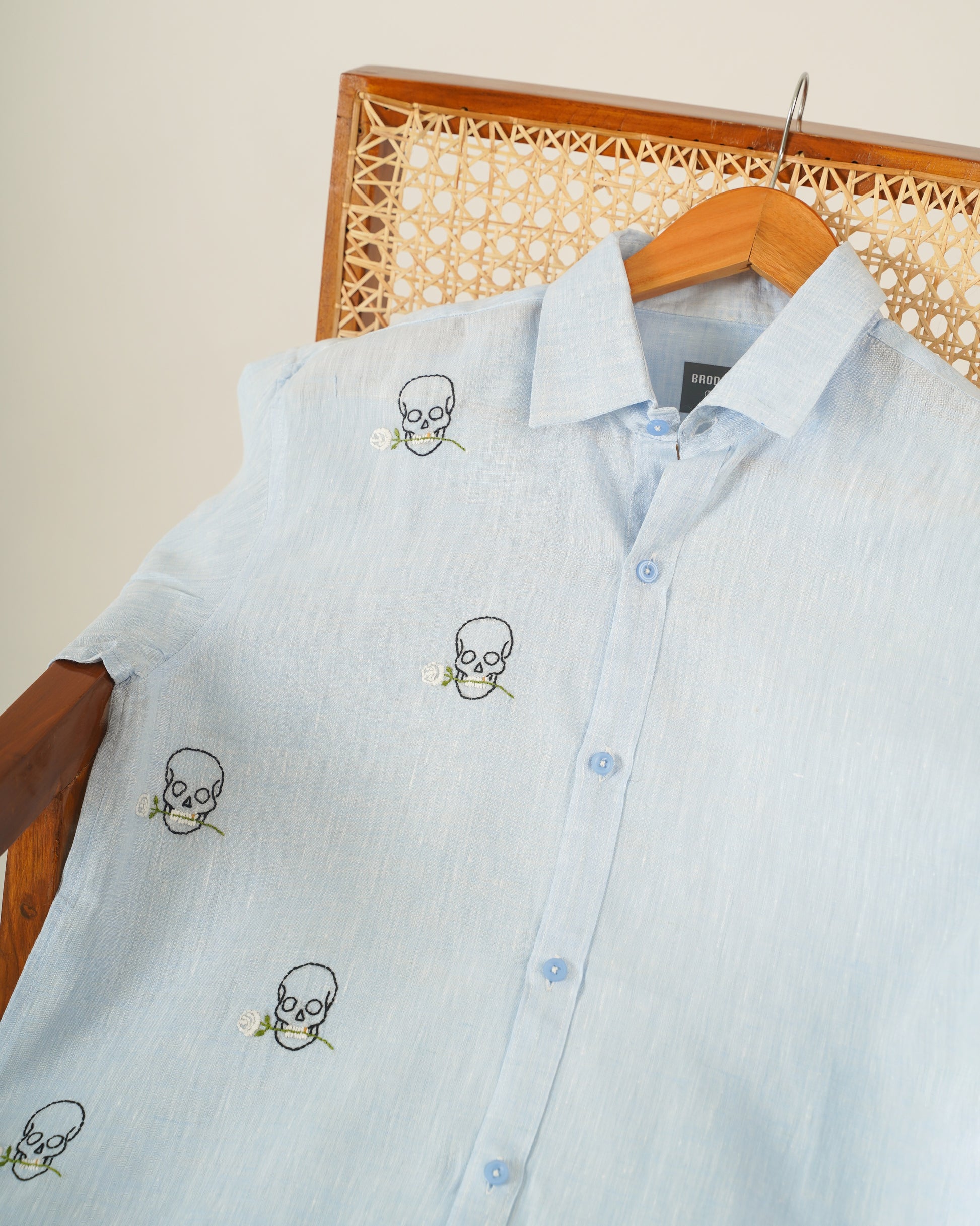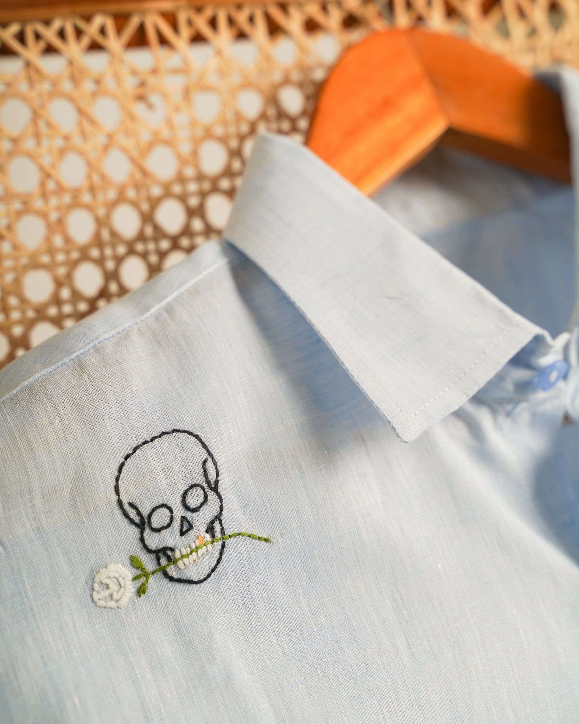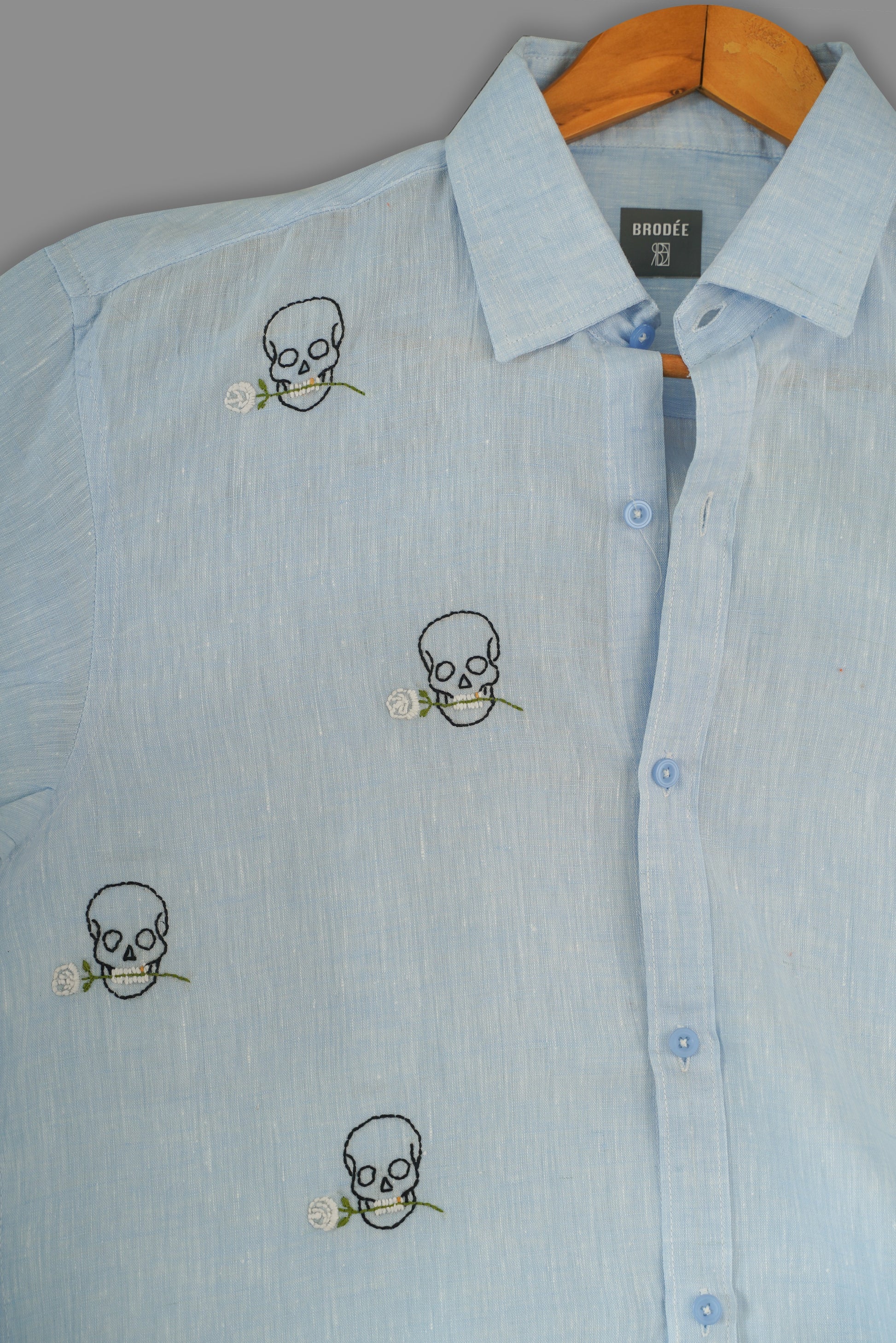 A skull with rose is a reminder to live life to the fullest. An inspirational thread work on the linen fabric crafted beautifully on one side of the brodée shirt makes it an one of a kind shirt.