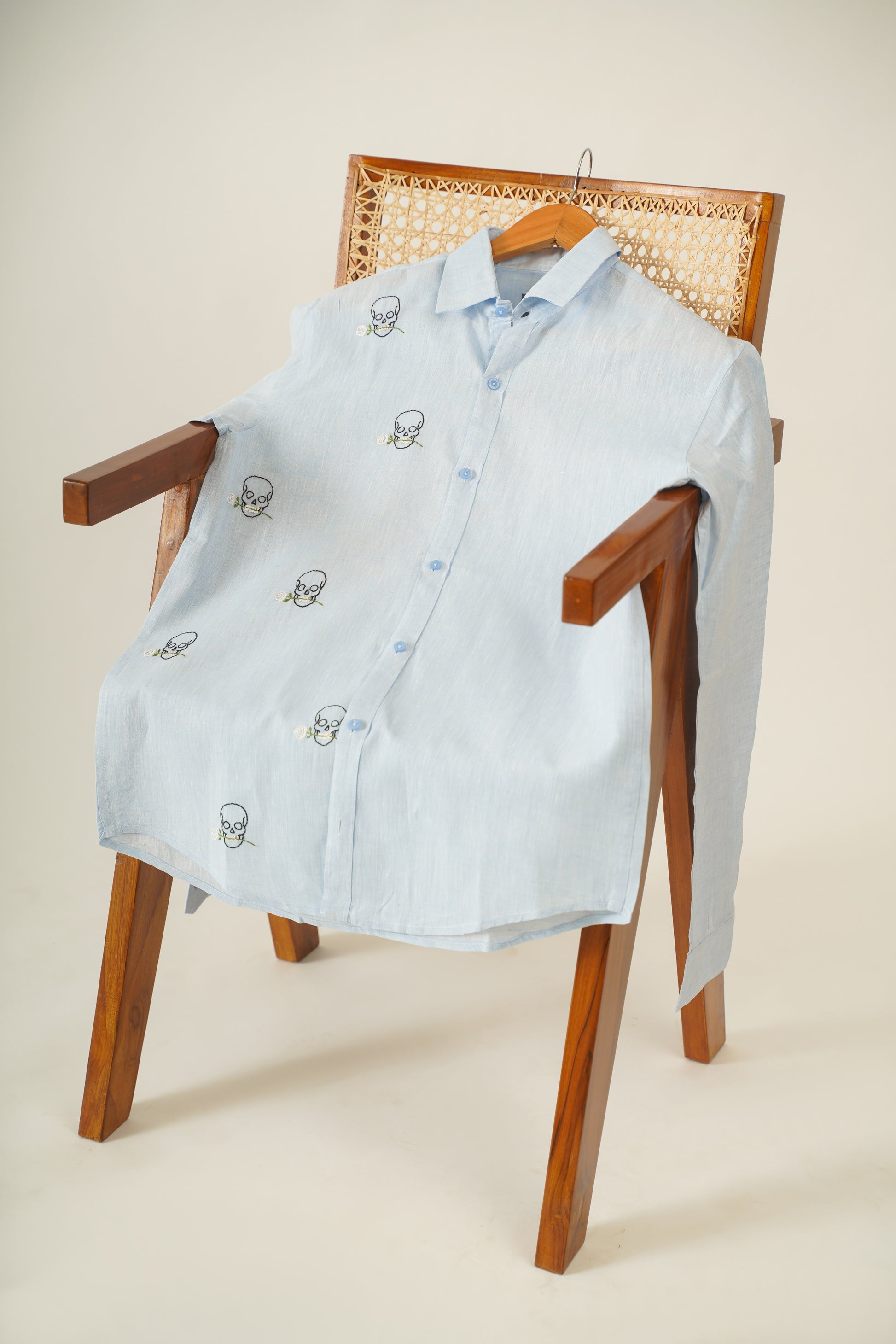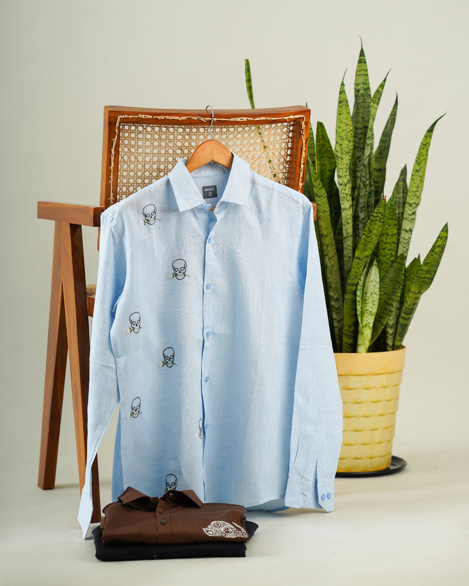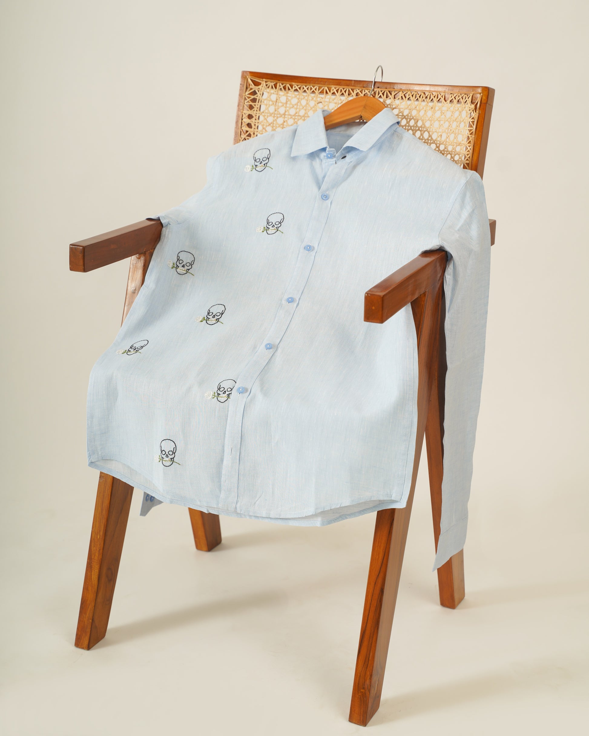 A skull with rose is a reminder to live life to the fullest. An inspirational thread work on the linen fabric crafted beautifully on one side of the brodée shirt makes it an one of a kind shirt.
