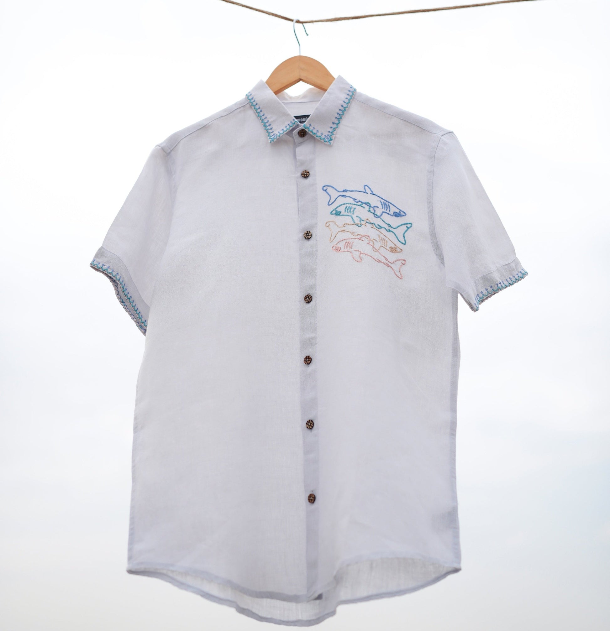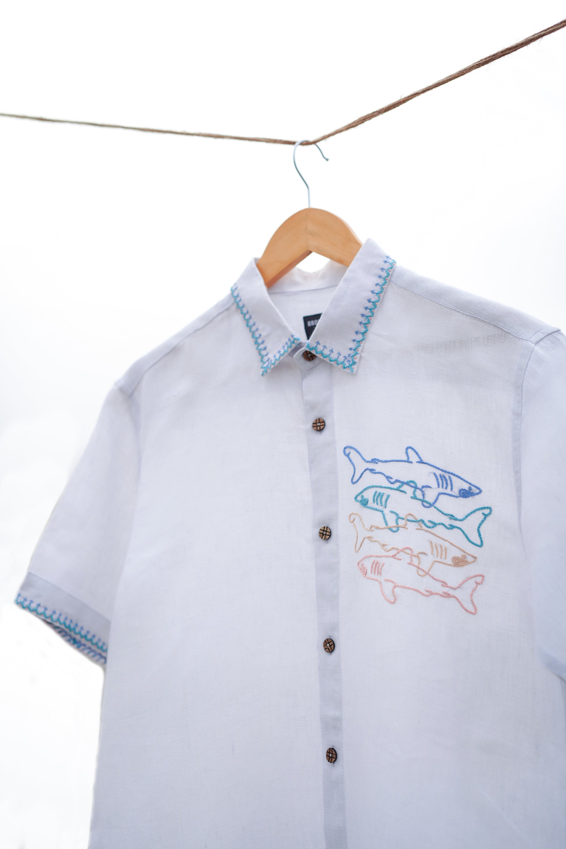 Shiver Of Sharks Brodée Shirt is a reference to the way sharks move through the water, cutting through it with their sleek and sharp bodies. As it aligns completely with look and feel of the shirt.